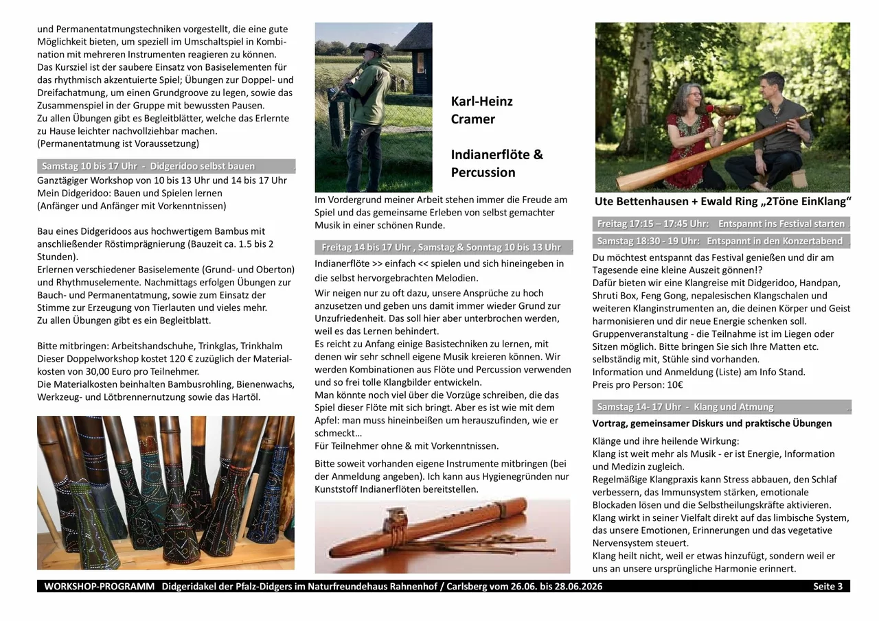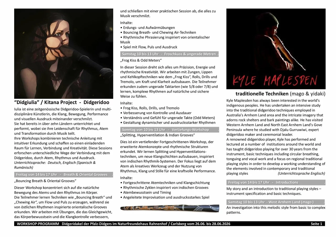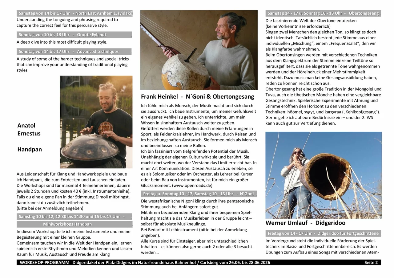 Freut euch auf ein breites Angebot rund um Didgeridoo (traditionell & modern), Atemtechniken, Rhythmus, Obertongesang, N’Goni, Handpan, Indianerflöte und Klangarbeit. Es gibt Workshops für Einsteiger ebenso wie für Fortgeschrittene – sowie Schnupperangebote für Neugierige.
